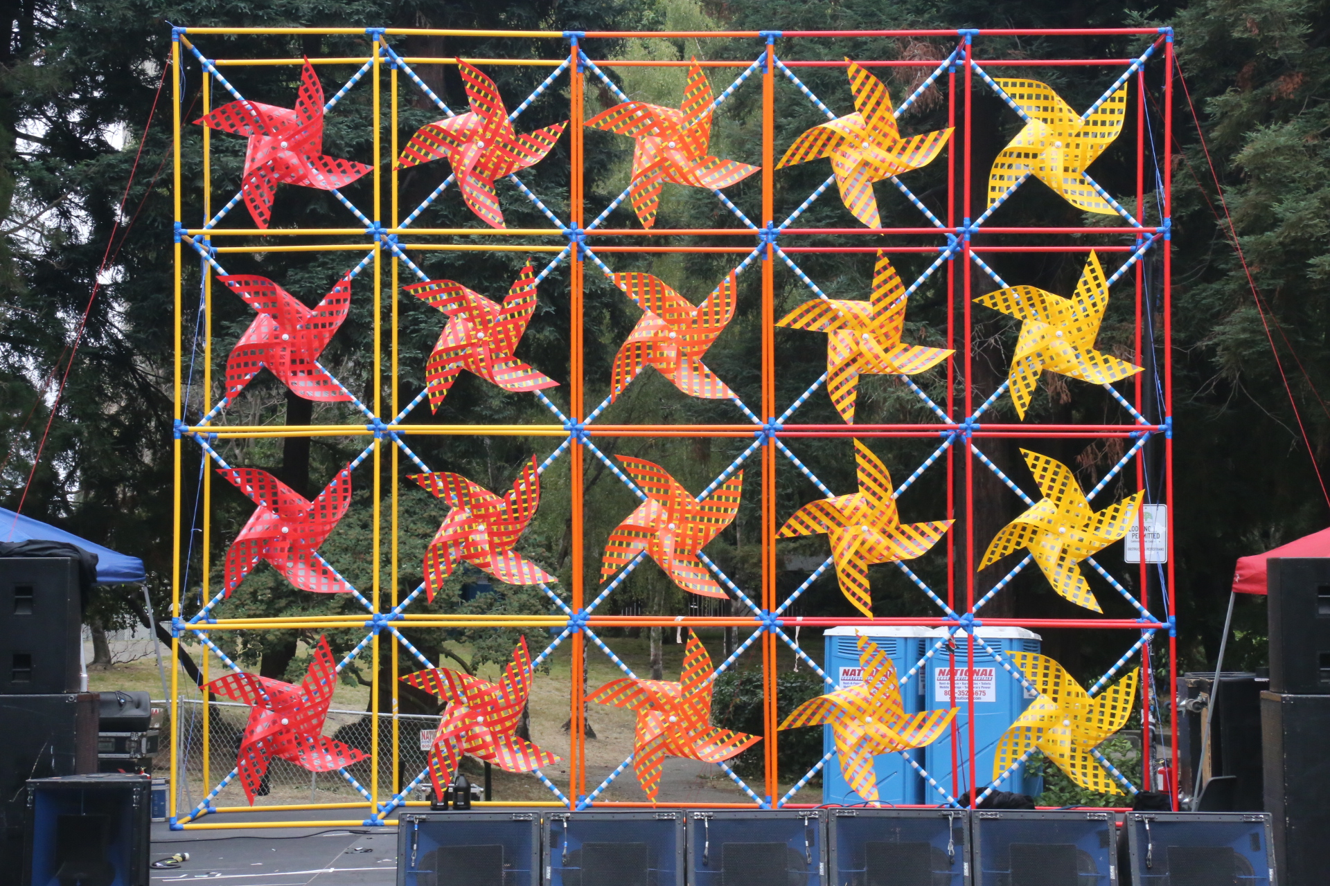 The stage design is made up of 20 colorful pinwheels, reinforced by a PVC frame. The colors & patterns of the stage are dynamic, changing as the pinwheels spin.